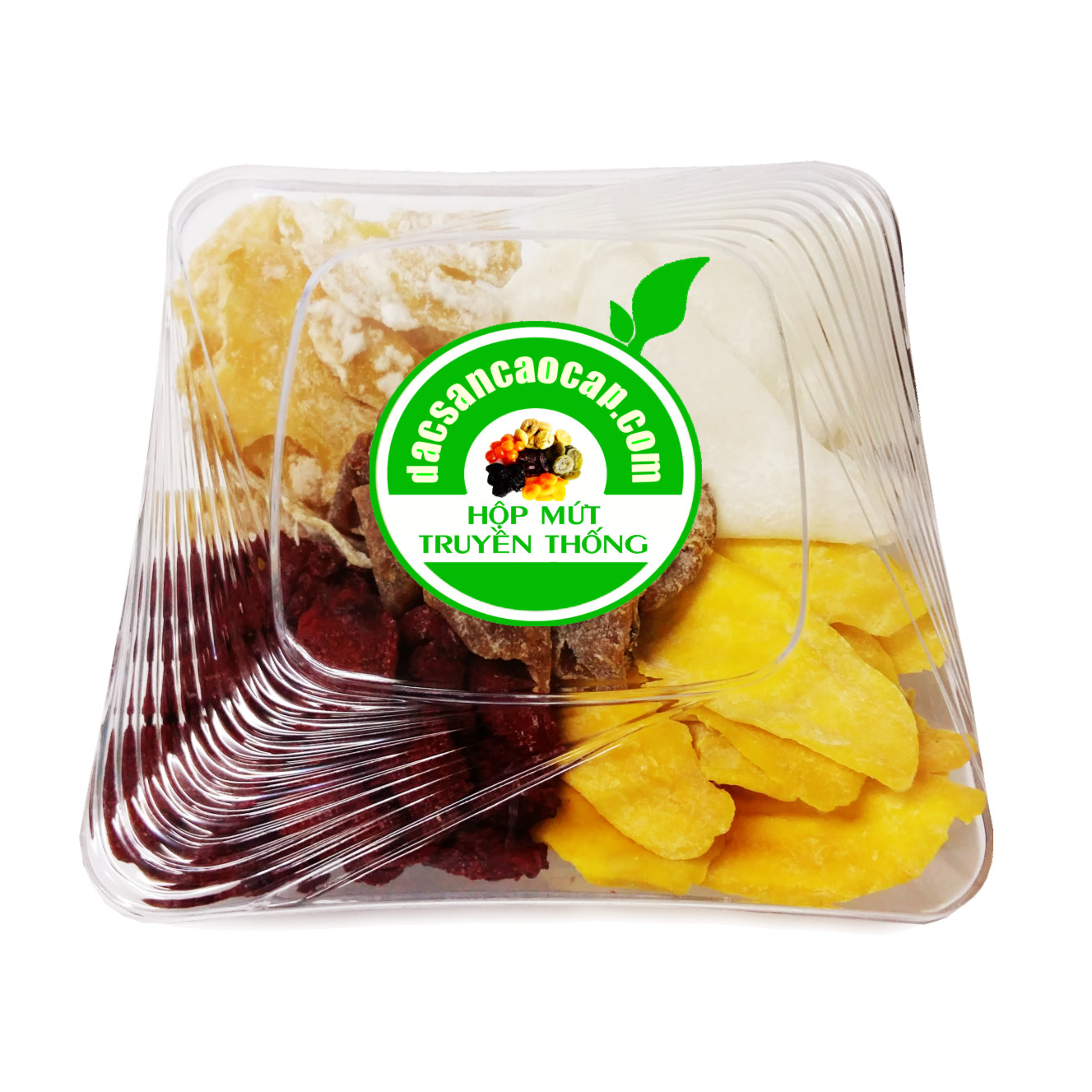 Hộp mứt dẻo truyền thống thơm ngon bao gồm 05 loại chanh dây, gừng, dừa non, xoài, dâu được chế biến tại Việt Nam với qui trình công nghệ hiện đại theo tiêu chuẩn an toàn thực phẩm, không sử dụng chất bảo quản, không ướp hóa chất hay bất cứ phụ gia nào. Hộp mứt thuộc dòng đặc sản cao cấp rất được ưa chuộng vì sự tiện lợi, gọn nhẹ, hương vị thơm ngon tự nhiên và rất an toàn.