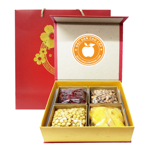 Hộp Quà Cao Cấp 01 với 04 loại trái cây hạt sấy được tuyển chọn vô cùng tinh túy bao gồm hạt điều, hạt sen, xoài, dâu tây. Tất cả đều là những món đặc sản ngon quen thuộc. Được chọn lọc nhiều loại đặc sản Thuần Việt trong những ngày Tết và luôn được chọn là món quà thắm đượm tình Việt dành biếu tặng mỗi dịp lễ tết. Bao bì được thiết kế đẹp mắt, sang trọng từ in ấn trang trí tỷ mỹ công phu, thích hợp để đãi khách, nhắm rượu, thưởng trà...