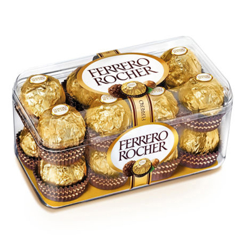 Kẹo Chocolate Ferrero Rocher 16 viên được tạo thành bởi nhiều lớp đan xen nhau: lớp ngoài cùng là chocolate nghiền với hạnh nhân, tiếp theo là một lớp bánh mỏng, giòn, tan ngay trong miệng. Bên trong lớp vỏ bánh là chocolate nguyên chất và cuối cùng là quả hạnh nhân. Mỗi viên có mùi vị giống nhau, được bọc bởi vọc màu vàng như một viên ngọc quý. Đây chắc chắn là sự lựa chọn hoàn hảo khi góp mặt trong các giỏ quà tặng.